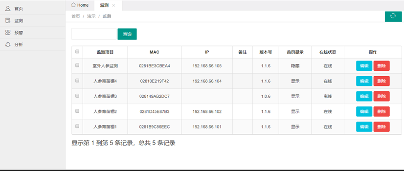 首頁顯示監(jiān)測數(shù)量、傳感器數(shù)量、監(jiān)控?cái)?shù)量、預(yù)警信息、最近24小時(shí)溫濕度監(jiān)控以及須在首頁顯示的監(jiān)測。