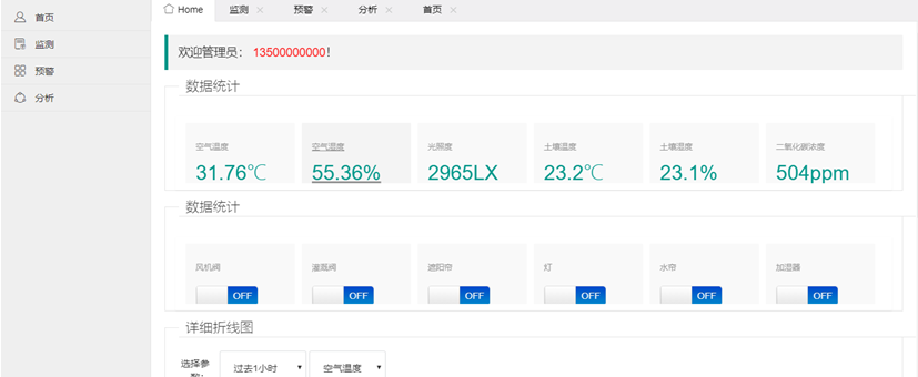 在【監(jiān)測】頁面,點(diǎn)擊列表右側(cè)詳情按鈕,進(jìn)入監(jiān)測詳情界面。上面部分顯示傳感器當(dāng)前狀況,下面部分分別顯示開關(guān)控制、數(shù)據(jù)統(tǒng)計(jì)以及預(yù)警參數(shù)。
