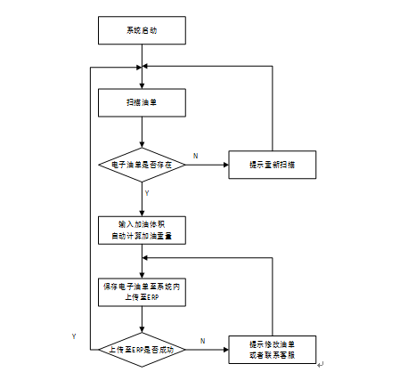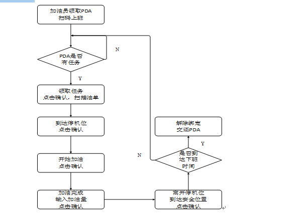- 加油員PDA端:應滿足“上班登陸→領取任務→掃車上車→任務完成→油單上傳”的主體工作流程,來完成加油員的工作需求。具體工作流程圖如下所示。