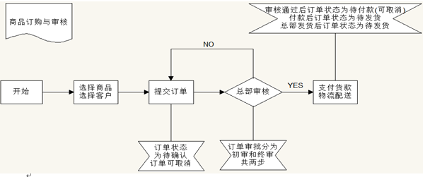 - 商品訂購:選擇商品->選擇客戶->提交訂單->等待審核->確認支付->等待收貨。