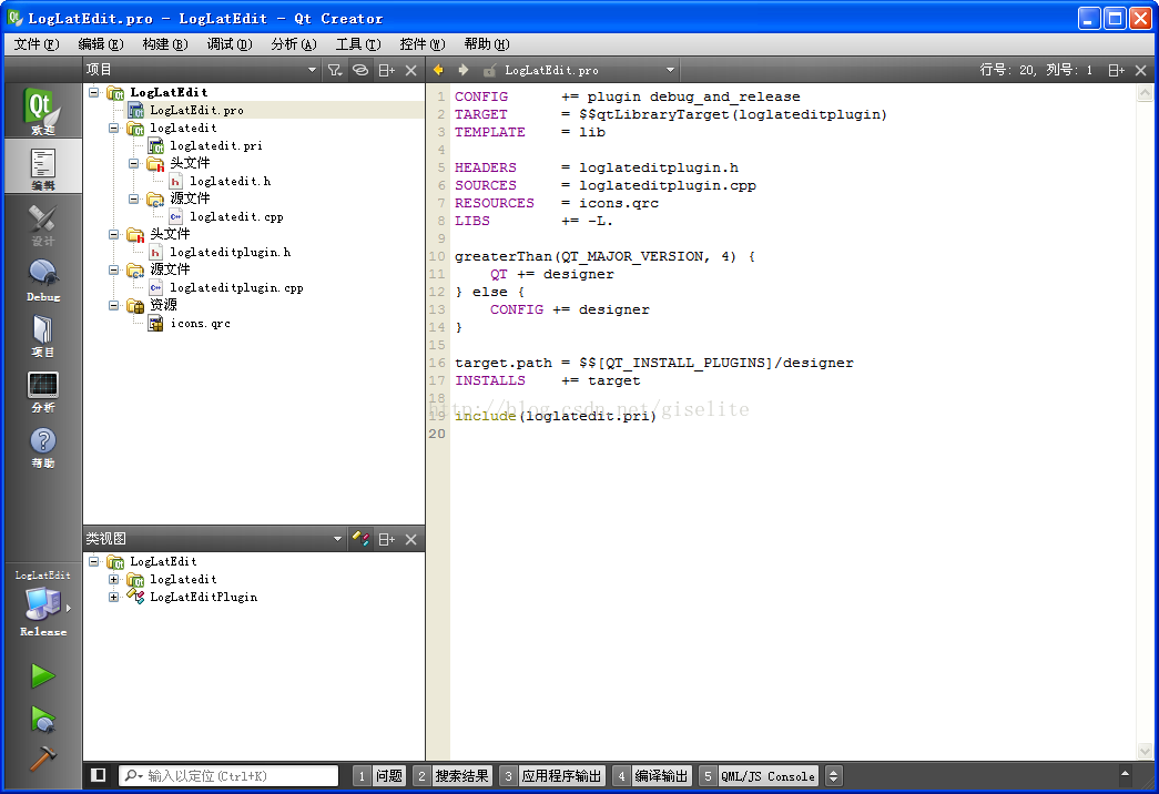 當我把自定義控件的dll和lib文件拷貝到D:Qt4.8.4pluginsdesigner目錄下,再啟動D:Qt4.8.4bin目錄下的designer.exe,這個插件可以加載到Widget Box里面去,但是如果我啟動D:Qtqtcreator-2.8.1bin目錄下的Qt Creator,我們的插件并不會出現在Qt Creator的設計器中。因此,對于Qt Creator,我們也需要執行以下控件的安裝,那么具體要安裝到哪里去呢?經過在Qt Creator安裝目錄下一番查找,發現D:Qtqtcreator-2.8.1binpluginsdesigner這個目錄下存在和D:Qt4.8.4pluginsdesigner目錄下同名的dll文件,于是我們猜測這個目錄就是Qt Creator的控件安裝目錄,接下來拷貝loglateditplugin.dll到這個目錄下,之后重新打開Qt Creator,發現自定義控件加載成功了,于是第一個問題解決了。