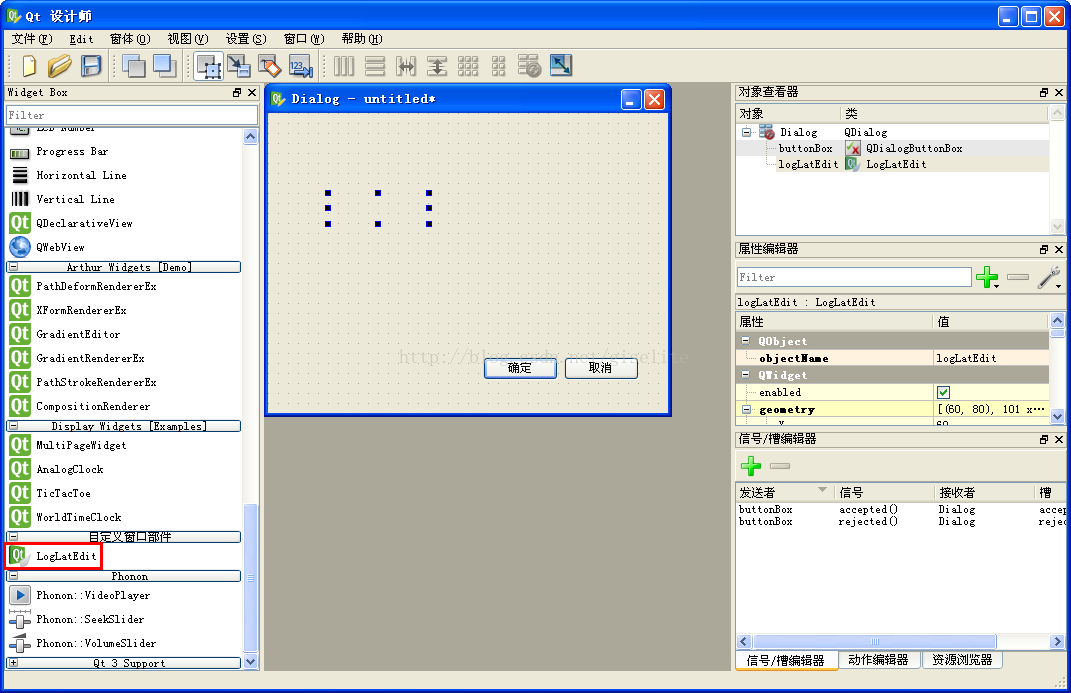 編譯完成后,在輸出目錄下,將生成的dll文件和lib文件一起拷貝到Qt的插件目錄下,以我使用的Qt 4.8.4為例,在Qt 4.8.4的安裝目錄D:Qt4.8.4下,找到plugins目錄,在其中找到designer目錄,然后把dll和lib放進去,完整路徑為:D:Qt4.8.4pluginsdesigner。之后,啟動D:Qt4.8.4bin下的designer.exe,創建一個窗體,此時就會發現在左側的Widget Box里出現了我們自己的LogLatEdit控件,我們可以像使用其它控件一樣,把我們自己的控件拖繪到窗體上,如下圖所示: