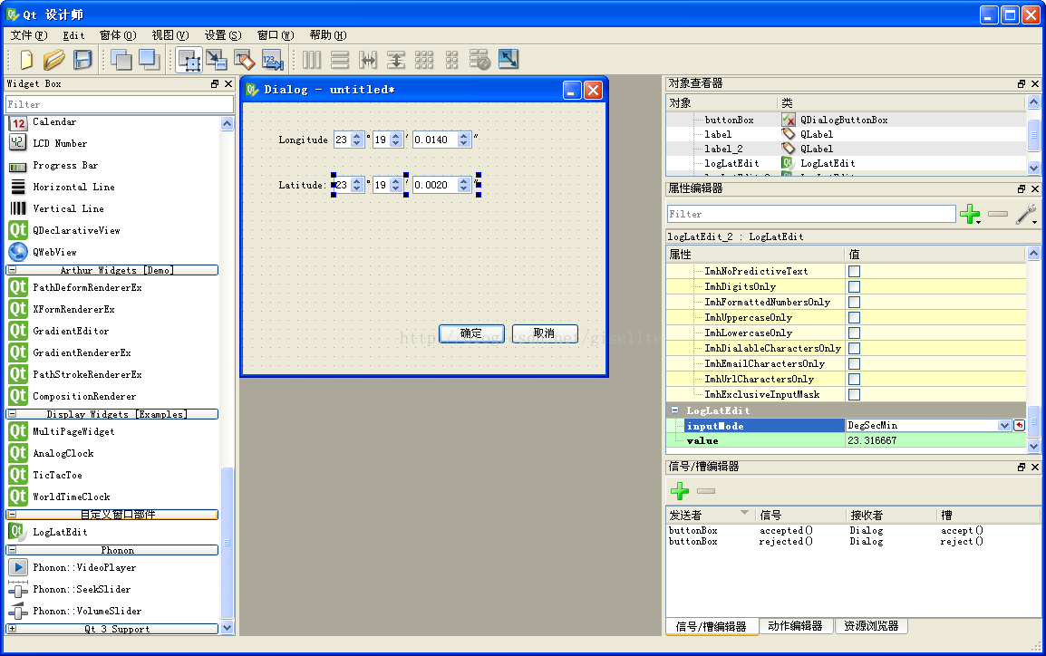 控件編寫完畢以后,把生成的dll和lib文件一起拷貝到Qt安裝目錄下的插件目錄里,比如我安裝在D盤里的Qt 4.8.4,路徑為:D:Qt4.8.4pluginsdesigner,拷貝進去以后,這個插件就可以被Qt Designer加載了,此時這個自定義控件就可以像普通的控件一樣使用了。當然如有必要,還可以給這個控件添加一些信號和槽,另外按照經緯度的取值范圍不同,做一下區分經度和維度的處理,本例中不需要這么復雜,就不再深入探索了,下面是使用自定義的經緯度輸入控件的效果: