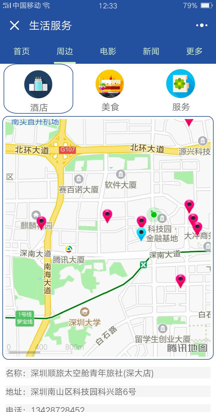 (1)調用百度地圖的各種服務,查詢酒店,美食,生活服務三種信息,更多信息可以看百度地圖的文檔