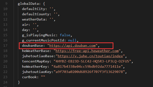 (2)比如,我們要獲取豆瓣電影的時候,我們需要調用豆瓣的api;我們先在app.js中的gloabData中定義doubanBase