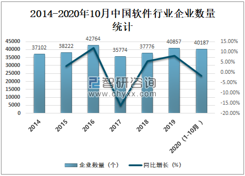 進入新世紀以來,中國經(jīng)濟與科技實力快速提升,軟件產(chǎn)業(yè)也因此得到了普及和推廣,不管是在工業(yè)生產(chǎn)還是在日常生活中,都有應用。2017-2019年中國軟件行業(yè)企業(yè)數(shù)量逐年增加,2019年中國軟件行業(yè)共有企業(yè)40857個,較2018年增加了3081個;2020年1-10月年中國軟件行業(yè)共有企業(yè)40187個,預計未來將繼續(xù)保持增長。
