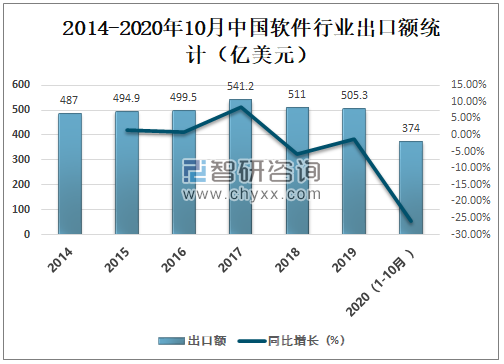 2017-2019年中國軟件行業(yè)出口額逐年下滑,2019年中國軟件行業(yè)出口額為505.3億元,較2018年減少了5.7億元,同比減少1.12%,2020年1-10月中國軟件行業(yè)出口額為374億元。