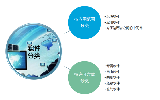 軟件按應用范圍劃分,一般來講軟件被劃分為系統(tǒng)軟件、應用軟件和介于這兩者之間的中間件。依據(jù)許可方式的不同,大致分為:專屬軟件、自由軟件、共享軟件、免費軟件、公共軟件。